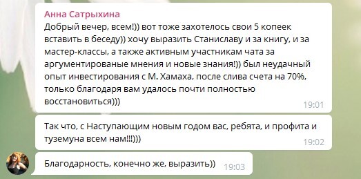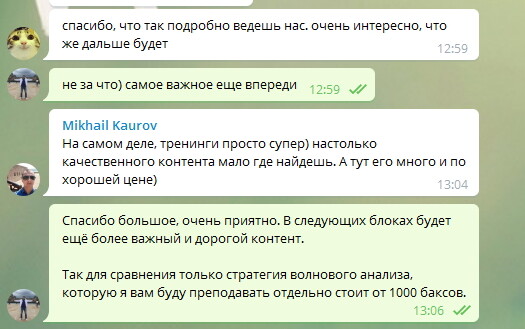 Для всех участников создается отдельный телеграмм канал, на котором вы можете обсуждать свои идеи и стратегии и получить обратную связь от меня