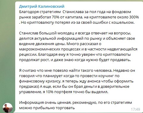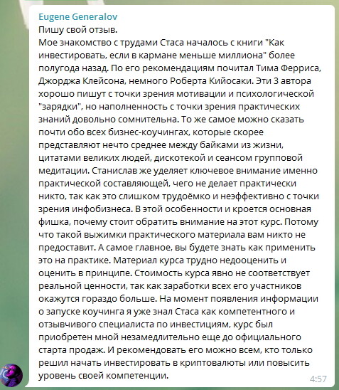 Станислав постоянно старается держать руку на пульсе постоянно изменяющегося мира инвестиций и старается делится актуальными моментами со своими последователями в рамках написанных им обучающих курсов и тренингов «Инвест-Блицкриг» и «Самый полный коучинг по инвестициям».